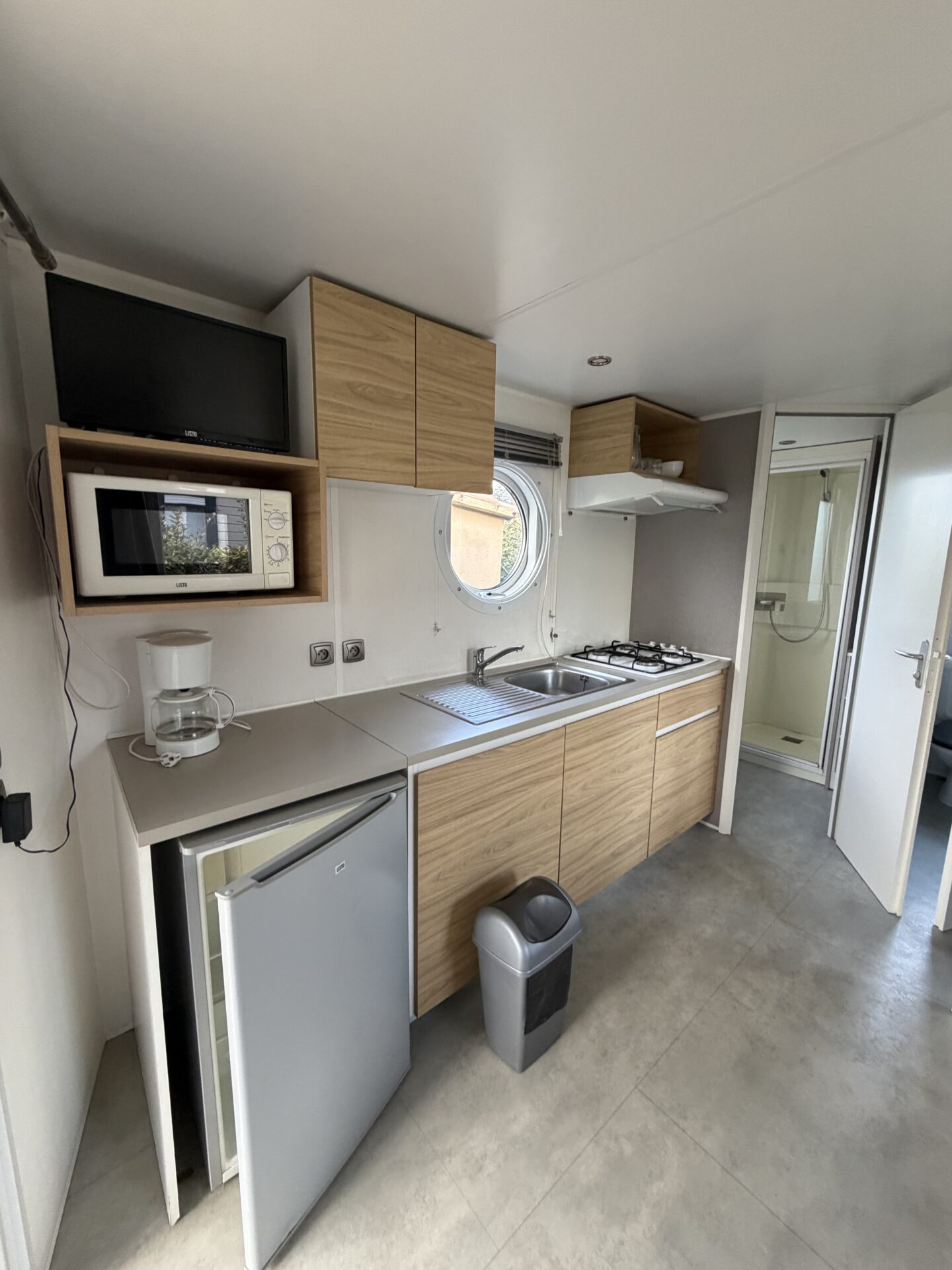 • Cuisine équipée avec kit vaisselle, micro onde, cafetière, réfrigérateur table top, plaque cuisson 4 feux gaz, rangements…